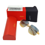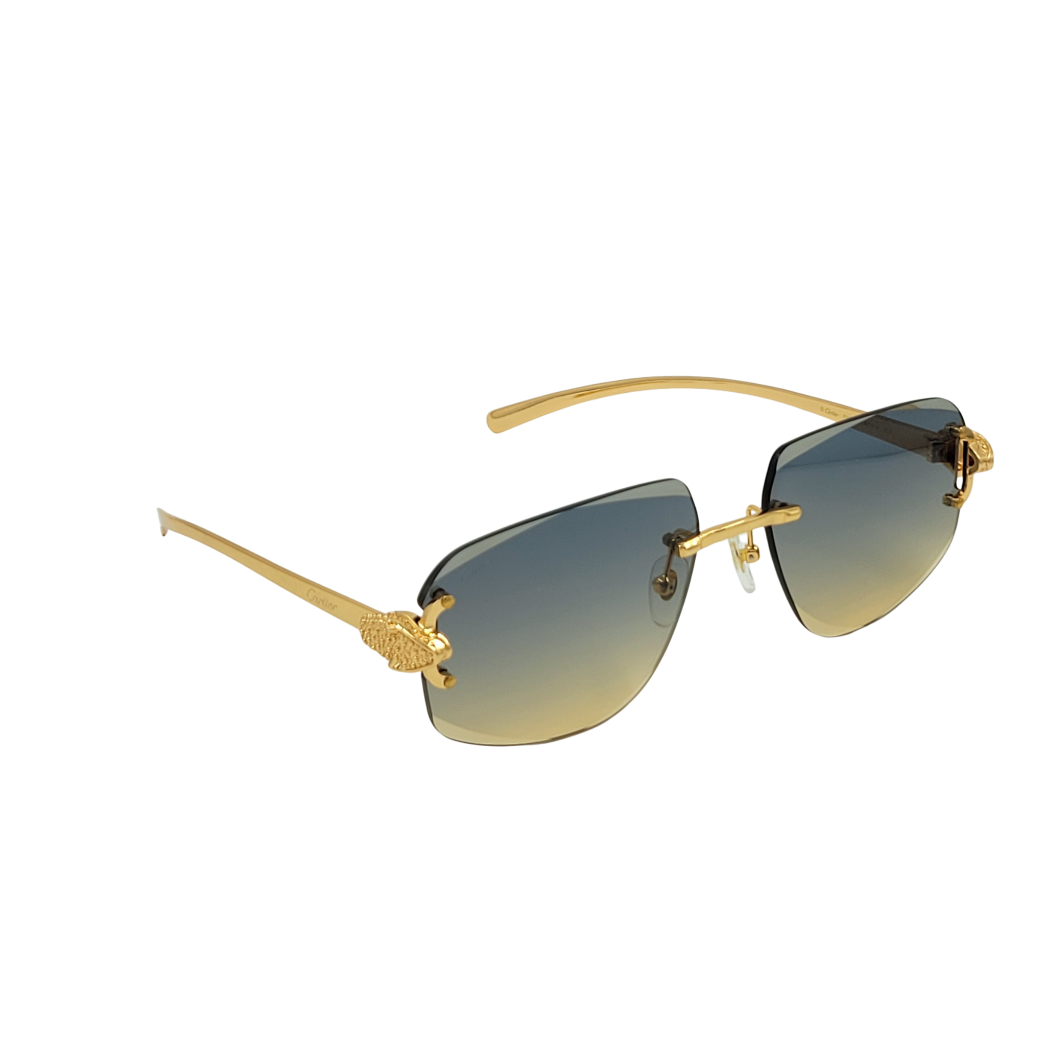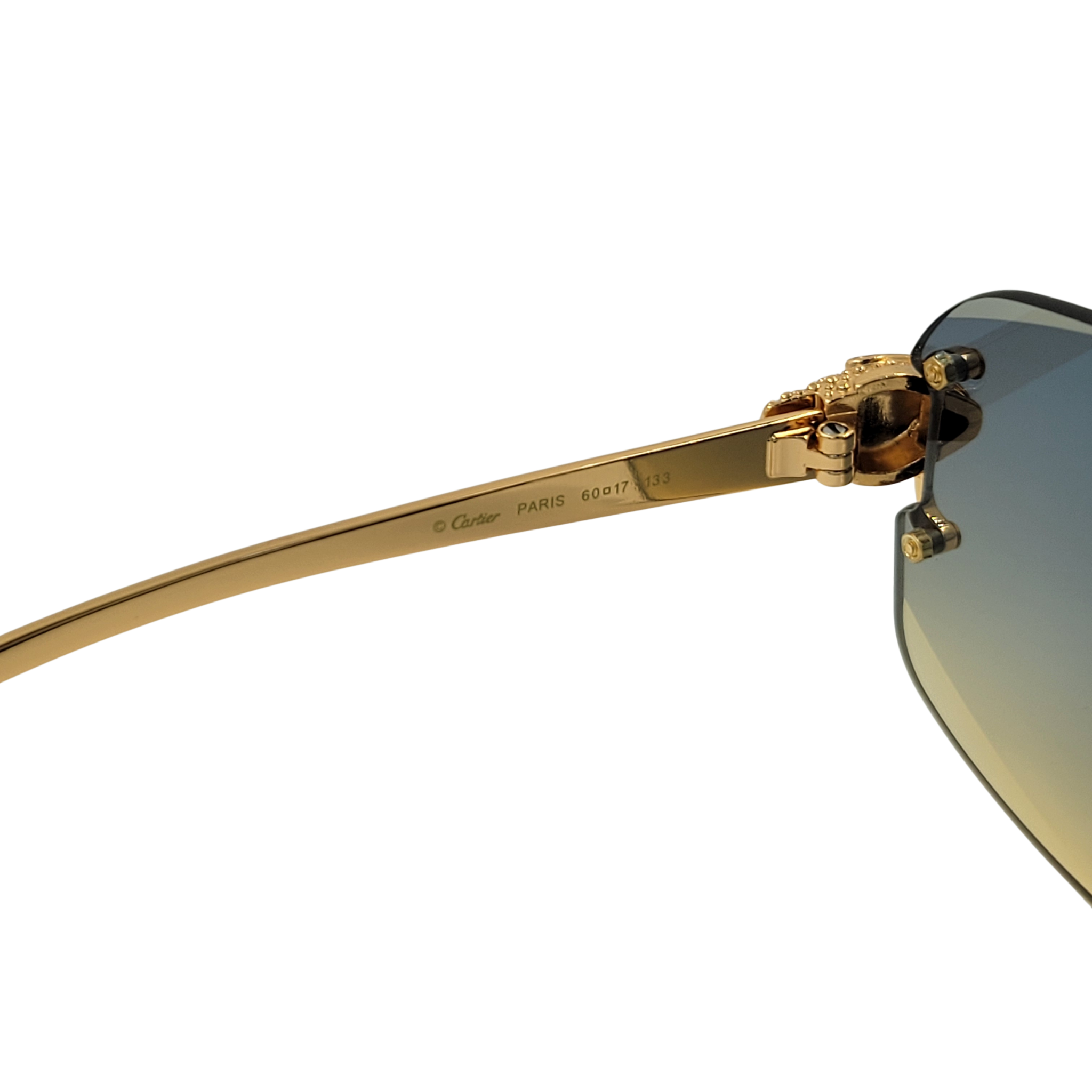 Rimless square design featuring smooth gradient lenses that fade from deep black to warm yellow, paired with gold-tone metal arms and signature Cartier panther heads — an exquisite mix of prestige and everyday flair.