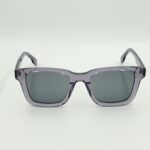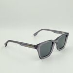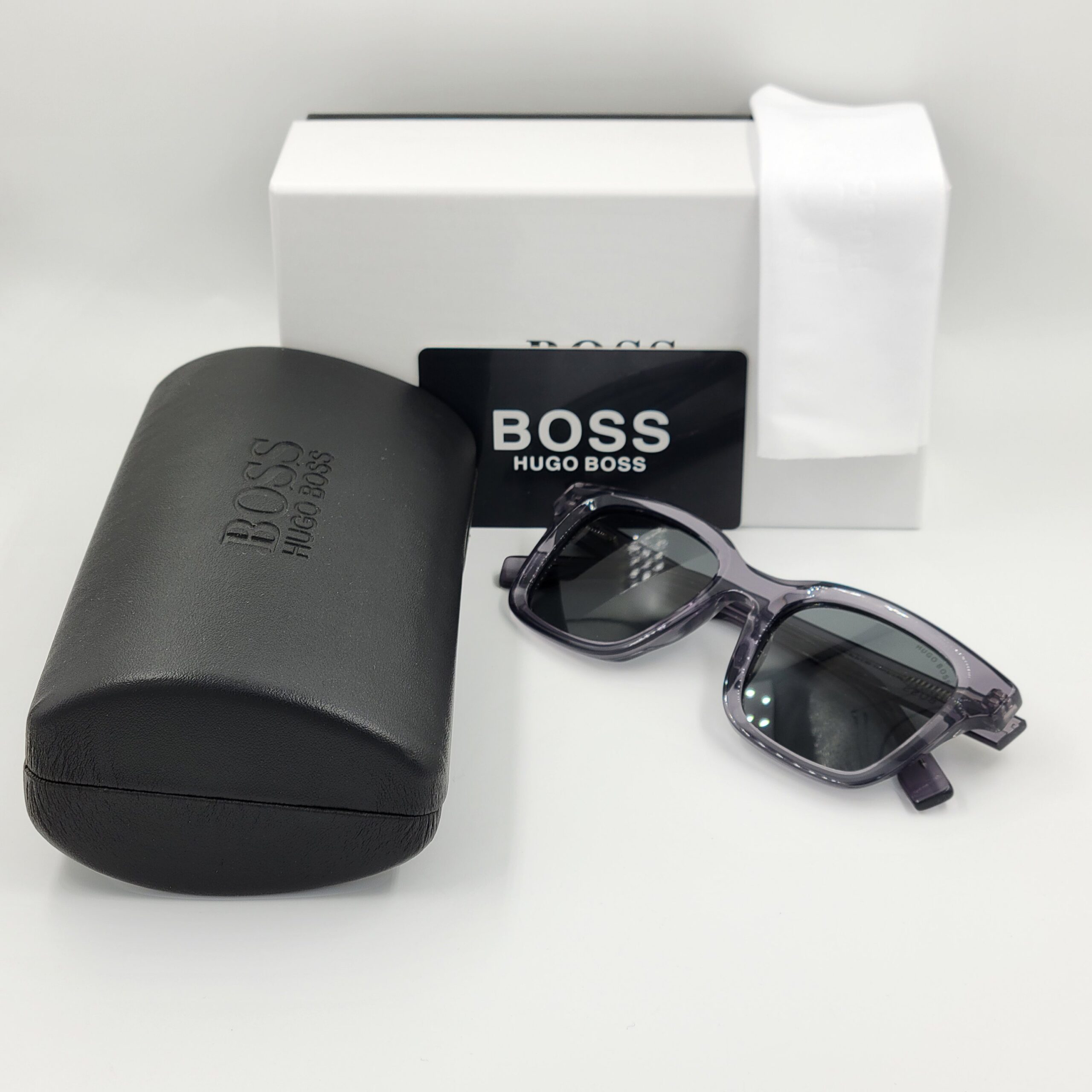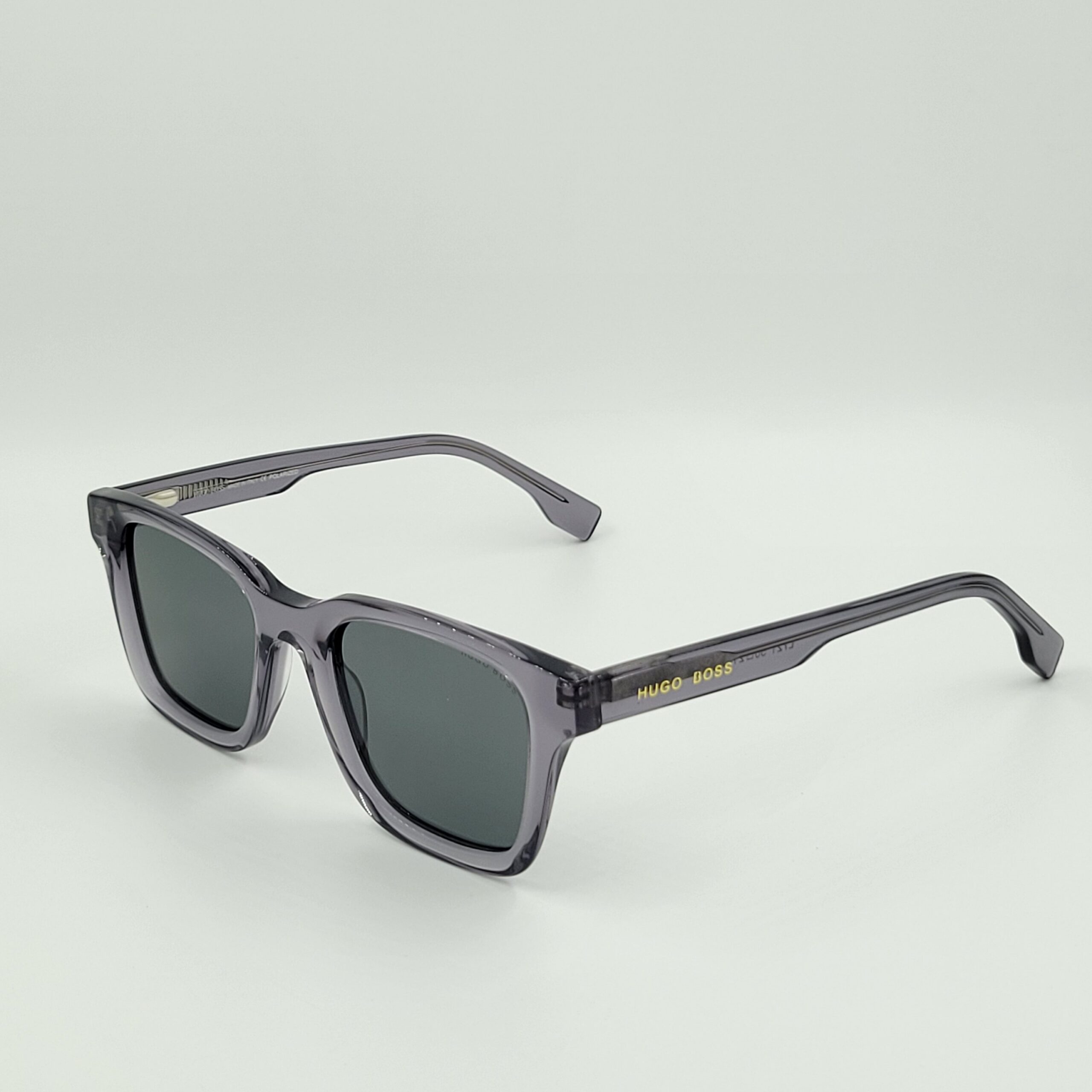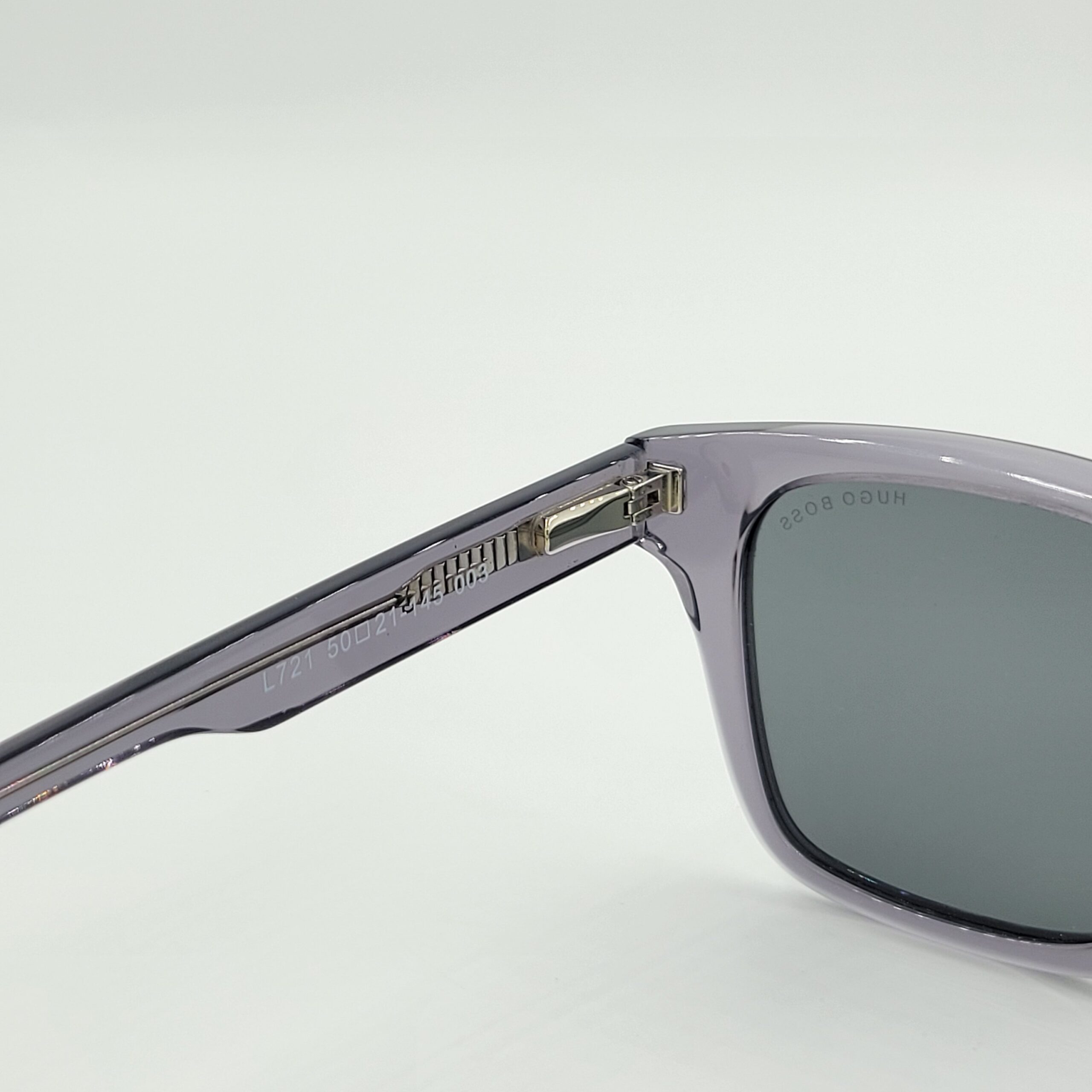 Translucent grey frame paired with dark grey lenses and gold Hugo Boss branding—minimalist style with bold attitude.