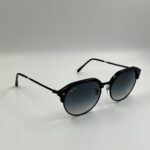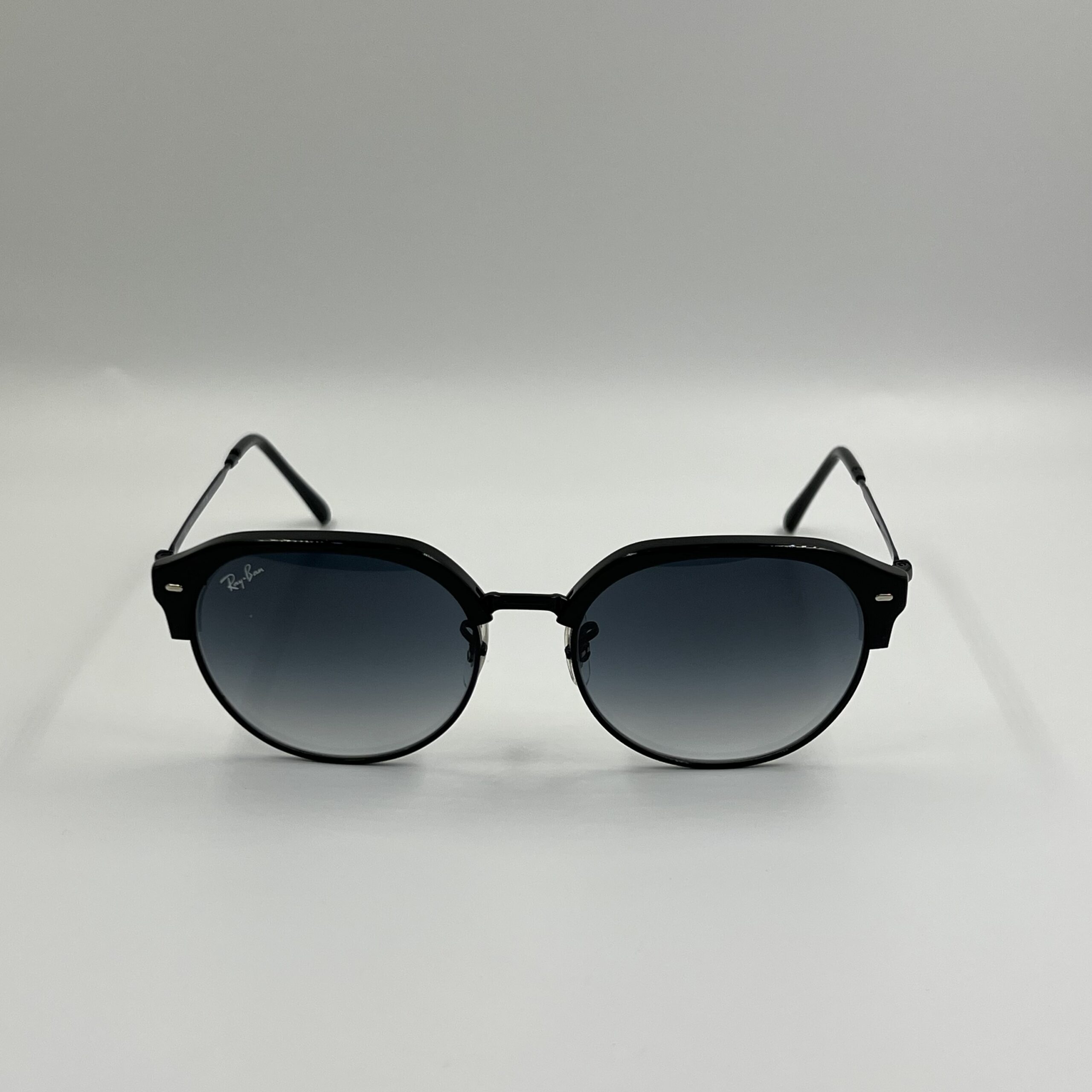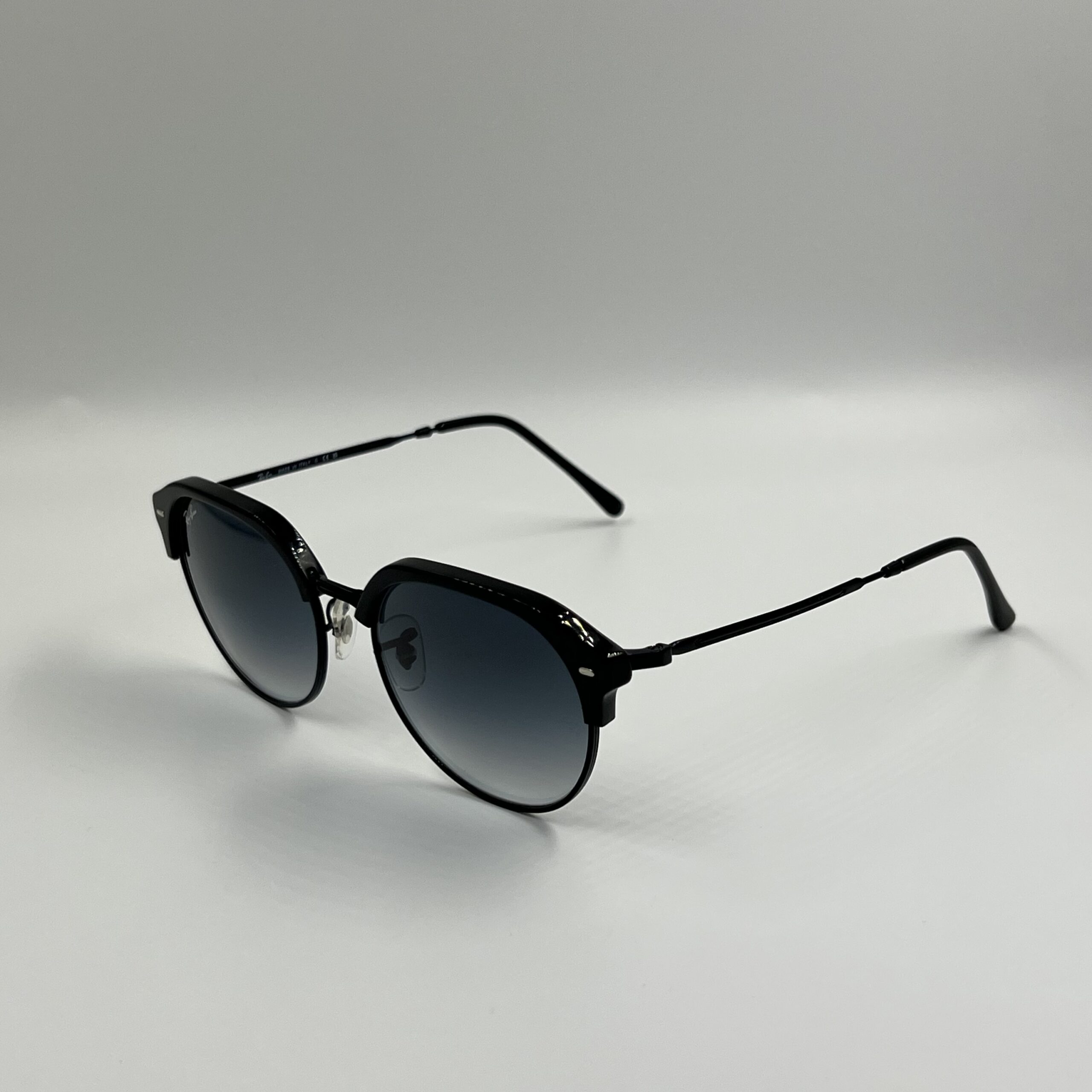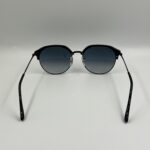 Glossy black acetate frame with gradient blue lenses and metal temples.
