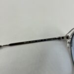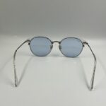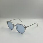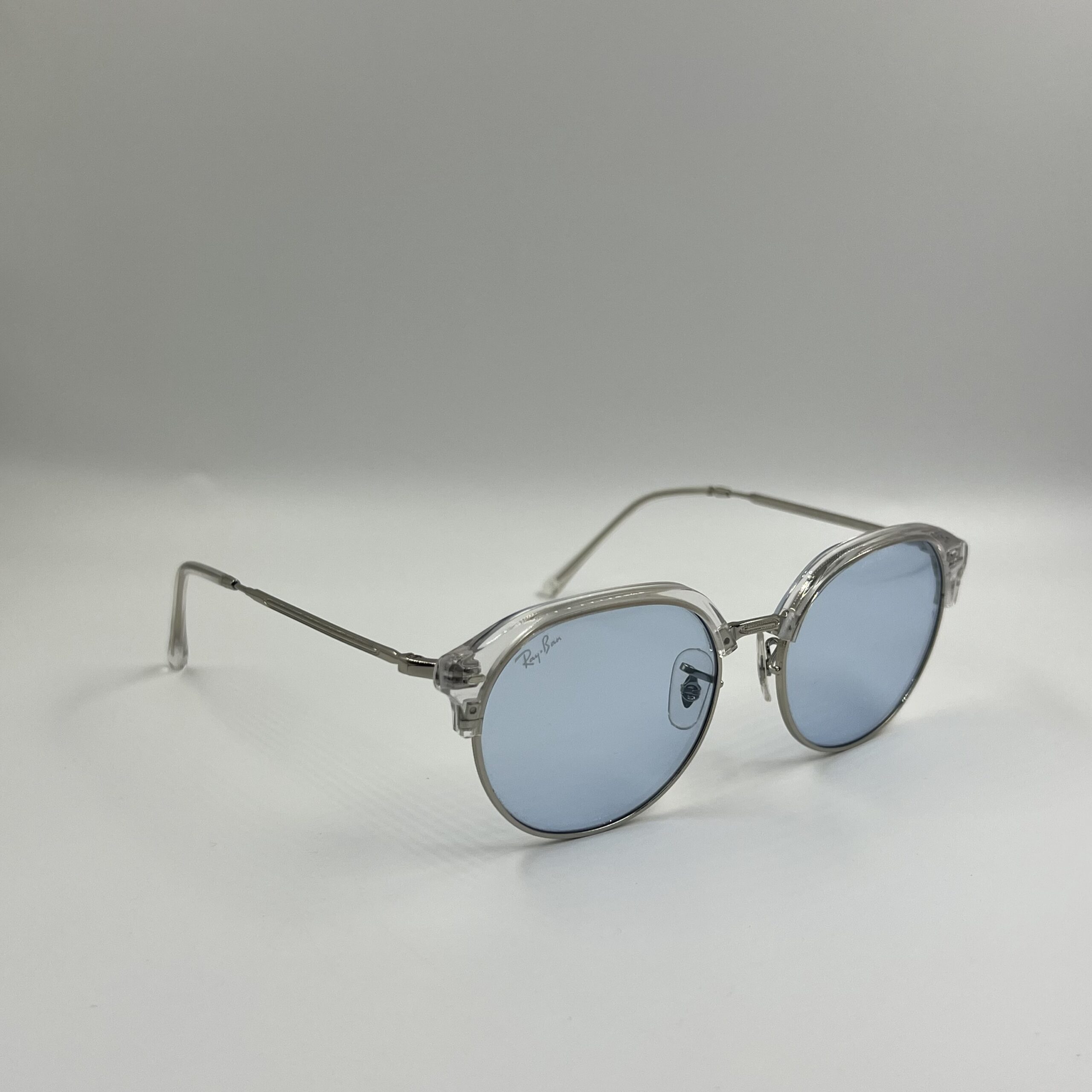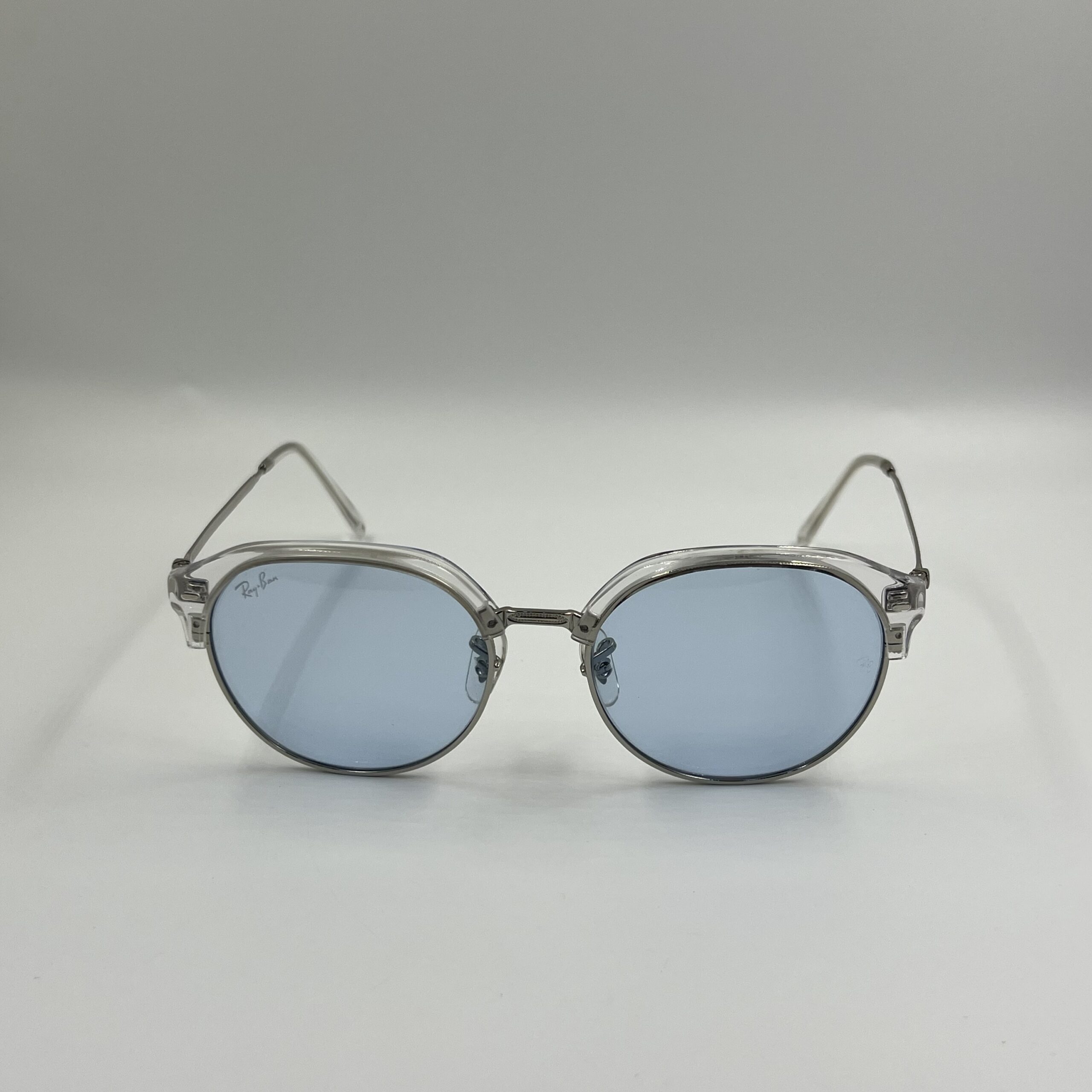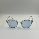 Transparent crystal frame with silver metal temples and cool light blue lenses.