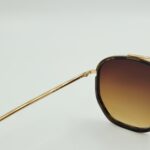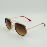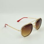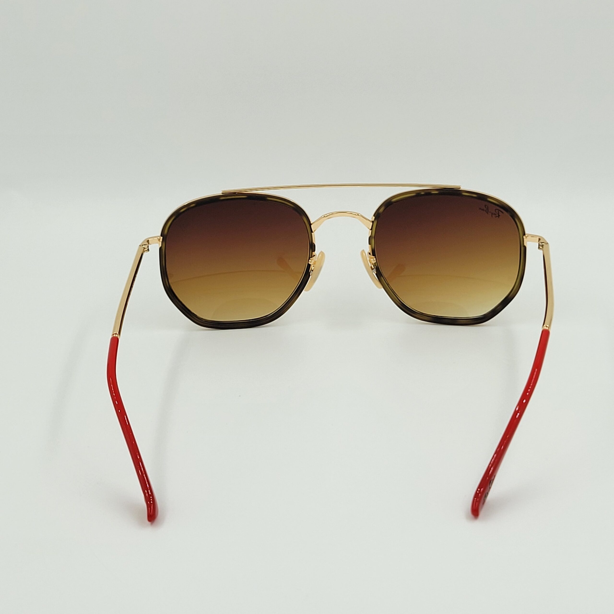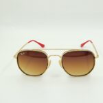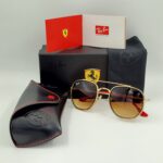 Gold metal frame with red temple tips and gradient brown lenses. Sporty yet elegant with signature Ferrari detailing.