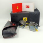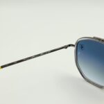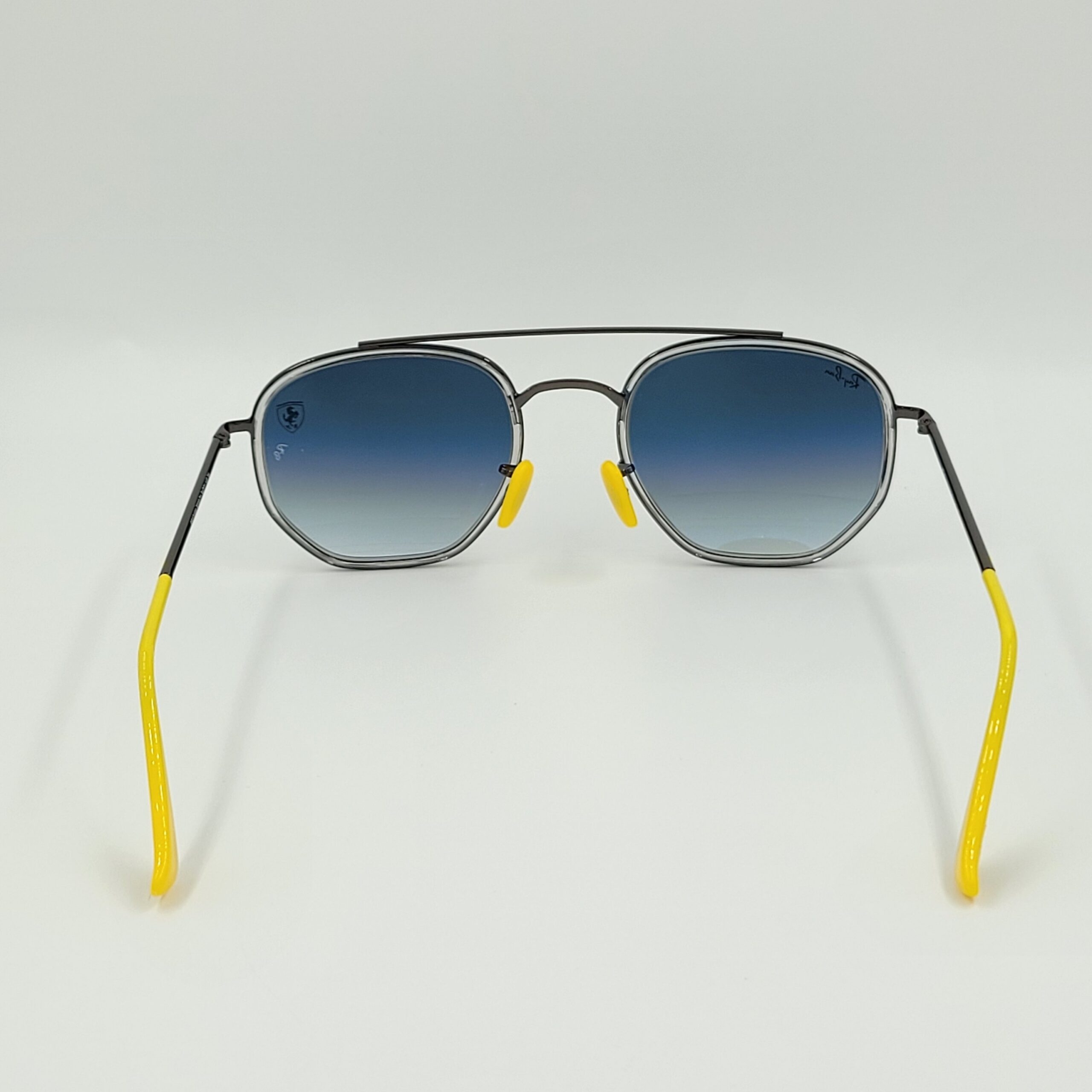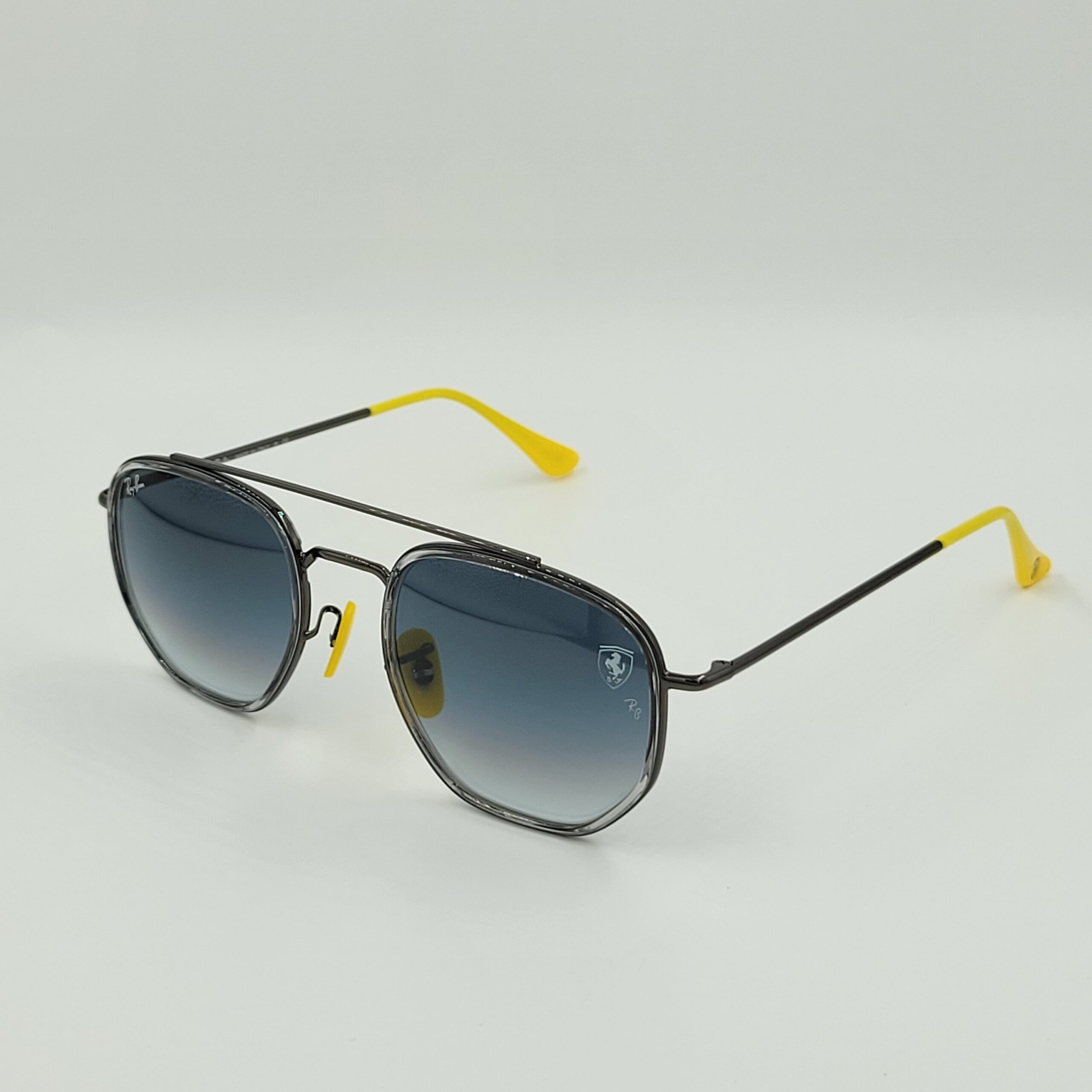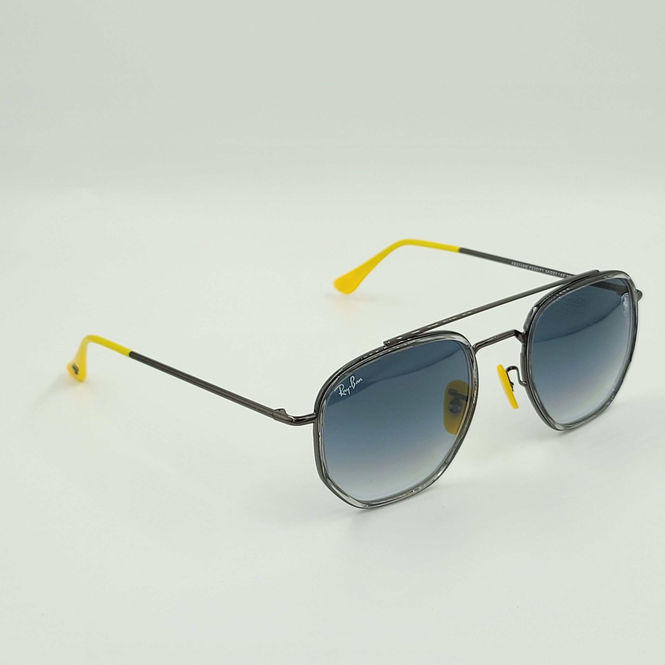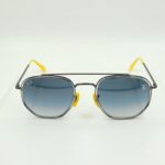 Gunmetal frame with grey trim, vibrant yellow temple tips, and gradient blue lenses. Motorsport-inspired with a refined edge.