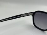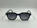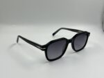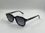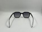Glossy black frame with a subtle geometric silhouette, paired with gradient grey lenses and transparent temple tips.