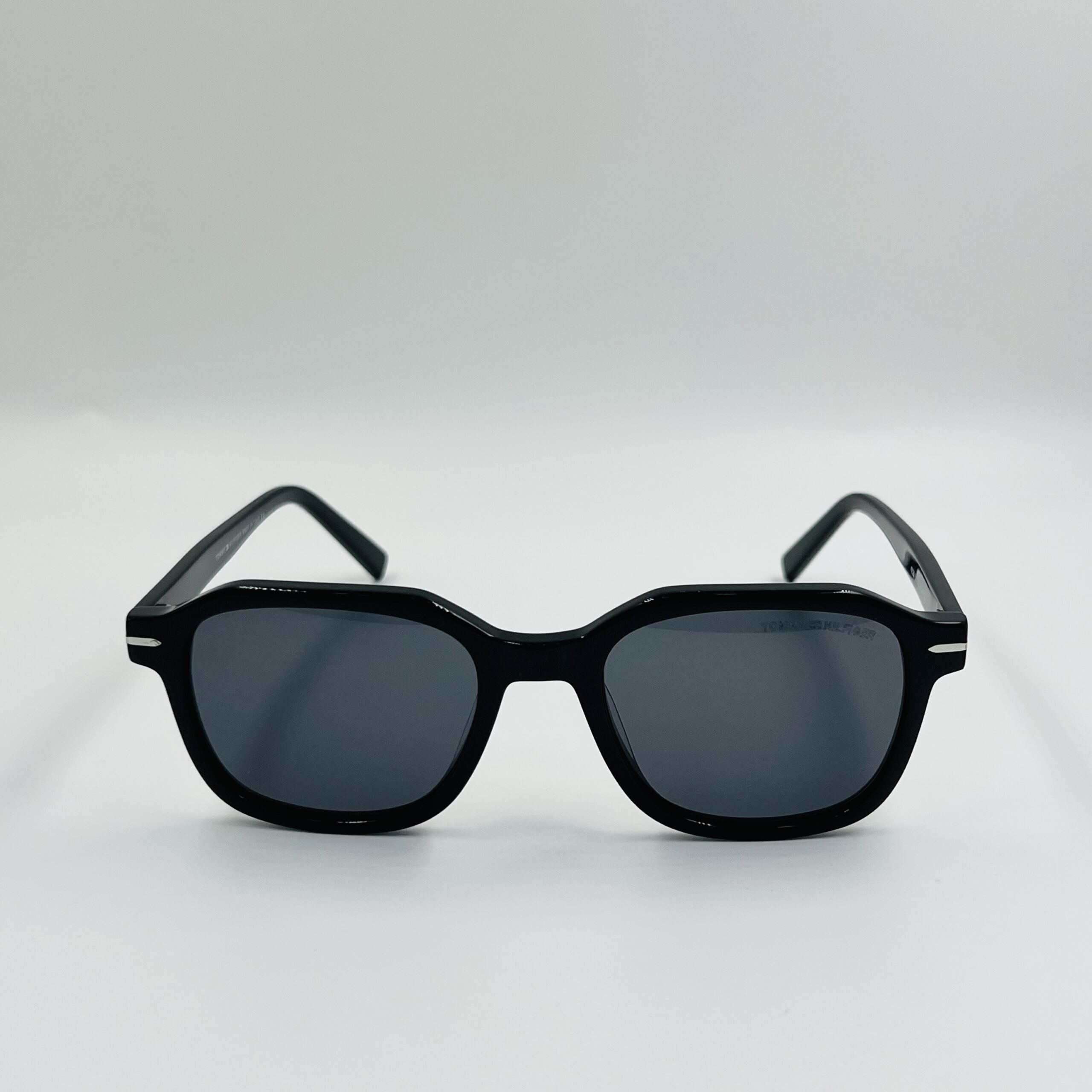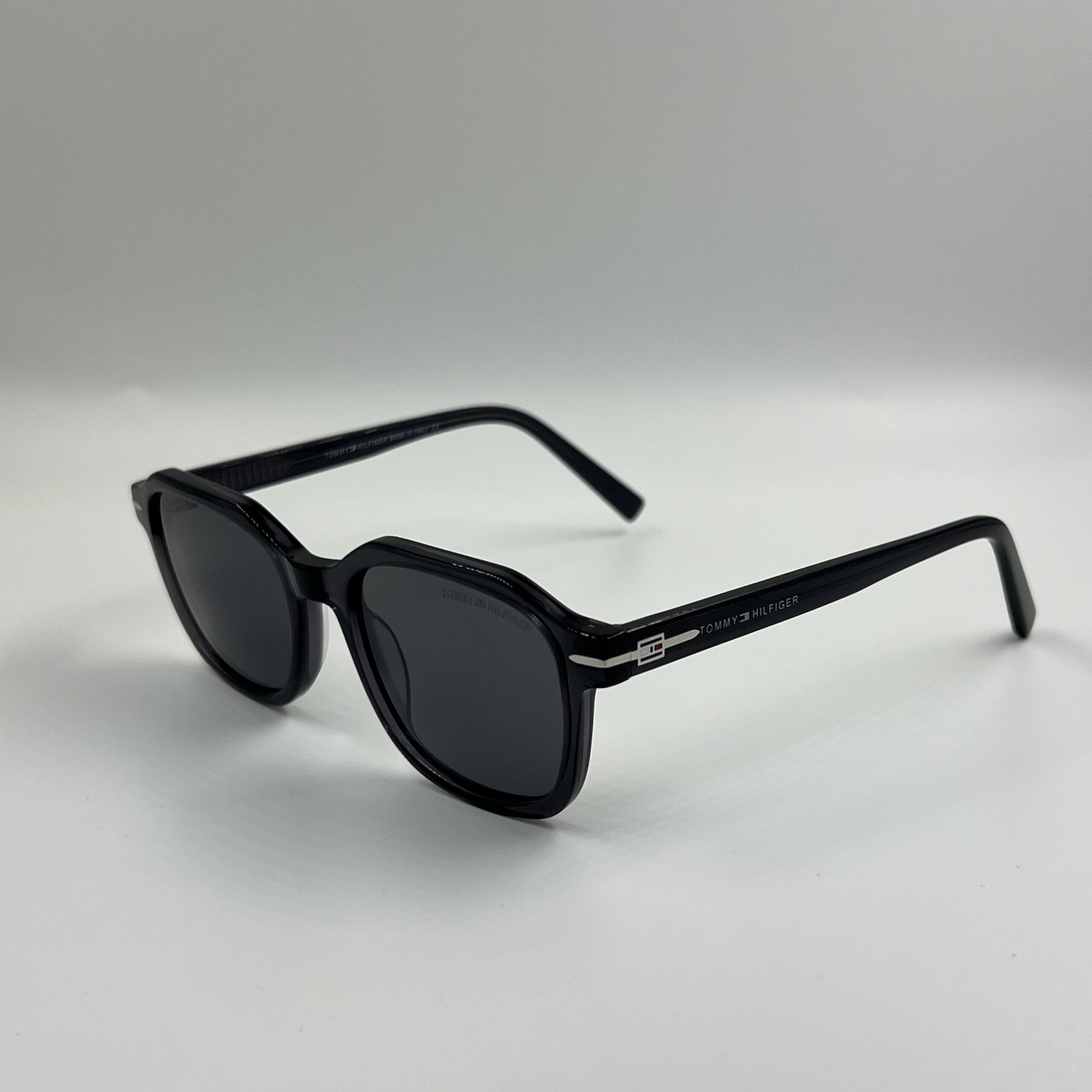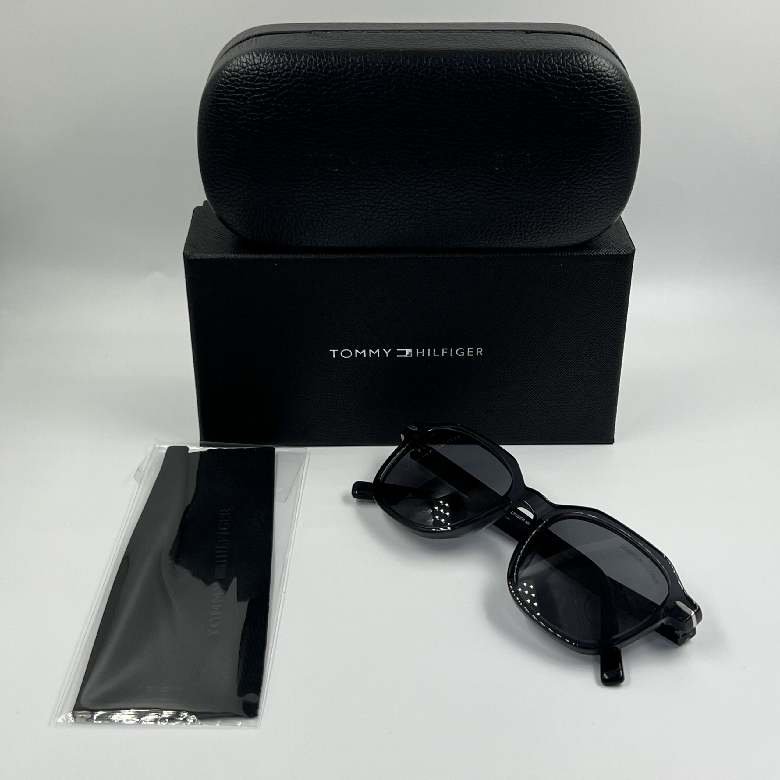 Black acetate frame with dark lenses and signature Tommy Hilfiger branding on the temples.